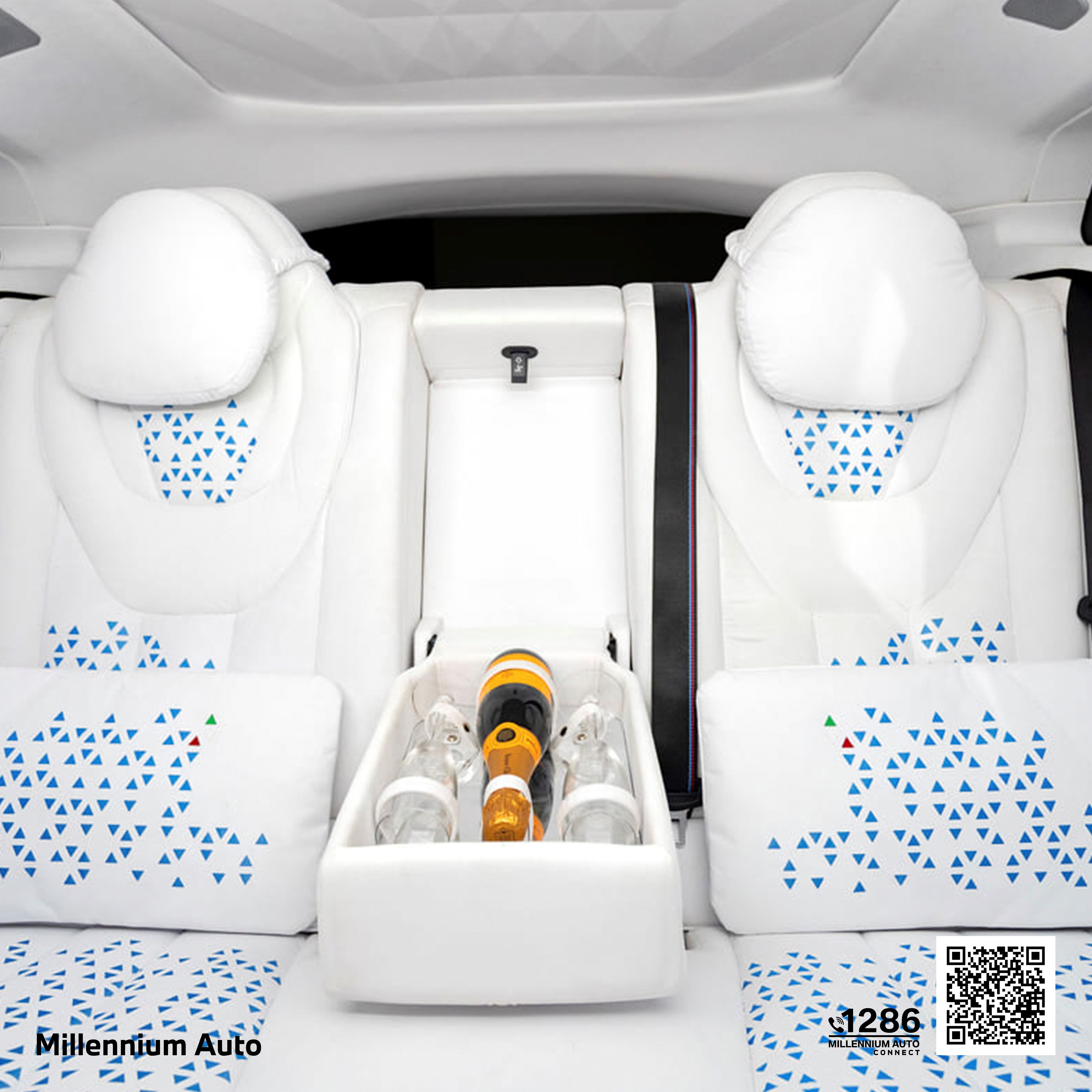 ภายในห้องโดยสารใช้ Alcantara สีดำและสีขาวน้ำแข็งตัดกัน พร้อมลวดลายเจาะรูด้วยเลเซอร์บนพื้นหลังสีน้ำเงิน สร้างบรรยากาศหรูหราและเป็นเอกลักษณ์ หลังคาตกแต่งด้วย Alcantara สีขาวพร้อมลายพิมพ์ดิจิทัลแบบไล่เฉดสี
