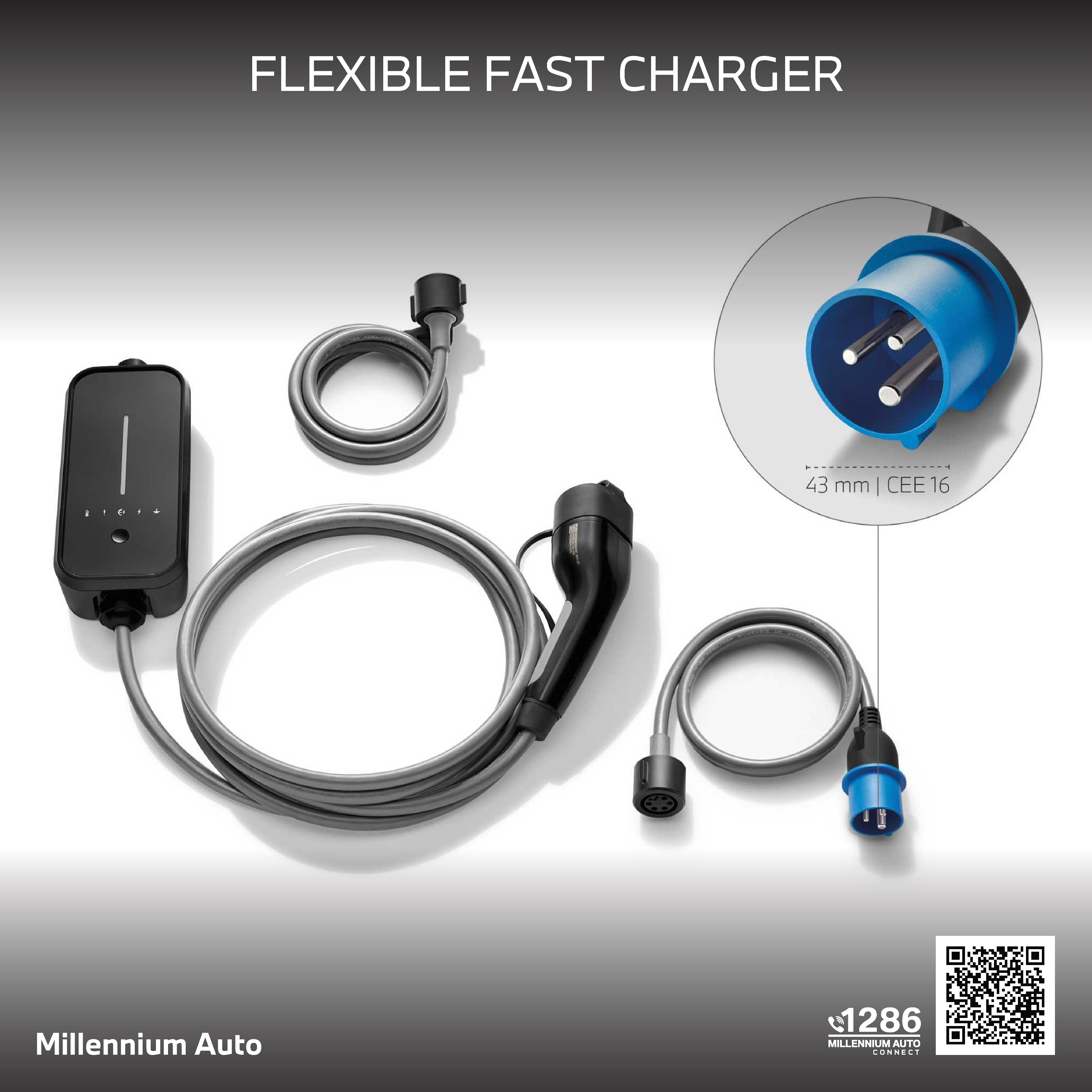 Flexible Fast Charger เป็นอีกหนึ่งอุปกรณ์ชาร์จเร็วที่พกติดรถไว้ได้ ออกแบบให้ง่ายสำหรับการชาร์จที่บ้าน ด้วยกล่องกันน้ำและสายเคเบิลยาว 6 เมตร พร้อมปลั๊กอะแดปเตอร์ที่เหมาะสมสำหรับซ็อกเก็ตในแต่ละภูมิภาคๆ และรองรับกำลังไฟสูงสุดถึง 11 กิโลวัตต์ เหมาะกับการใช้งานทั้งที่บ้านและระบบไฟแบบสามเฟส
