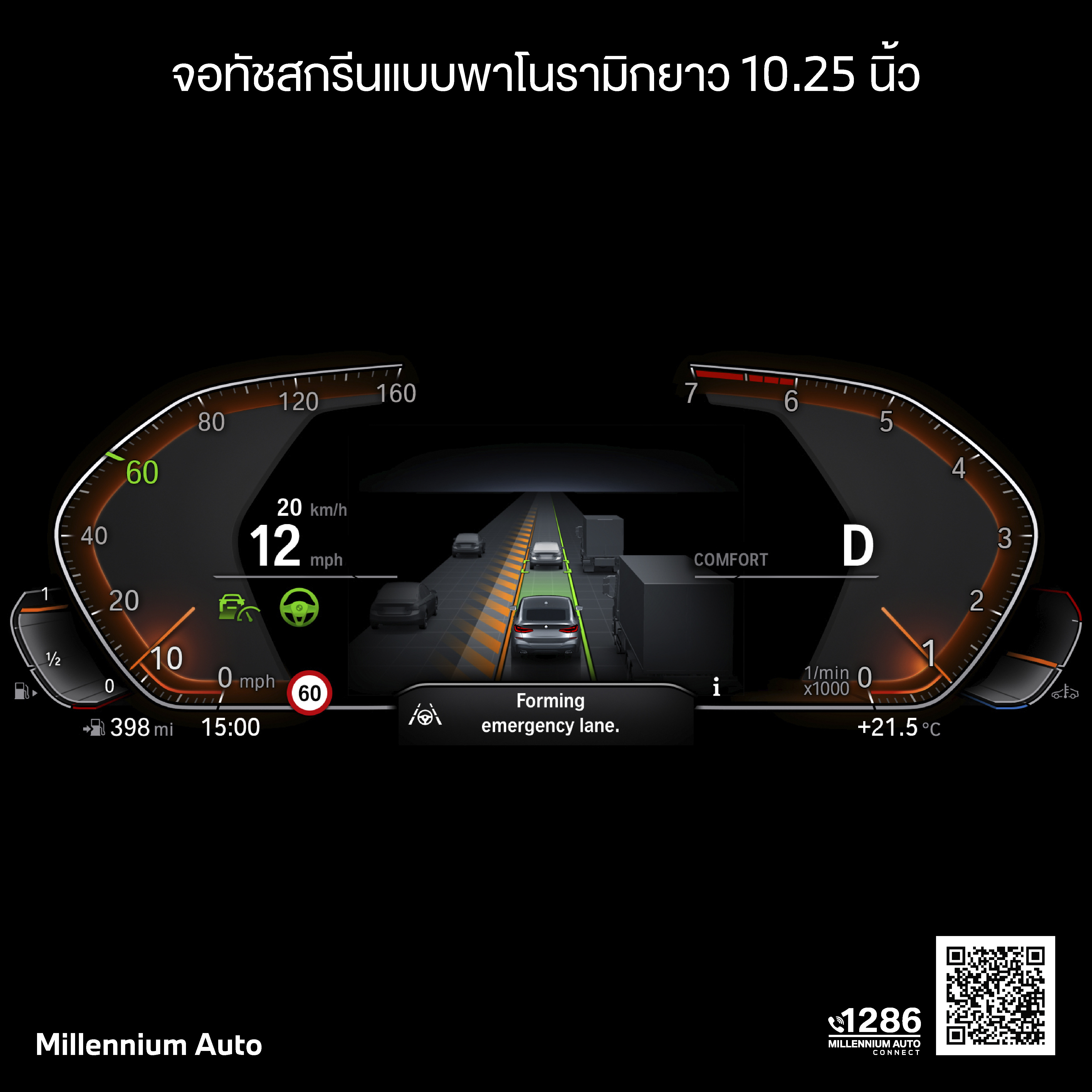 Driving Assistant Professional แพคเกจช่วยเหลือผู้ขับขี่ ที่รวมระบบลดความเร็วโดยอัตโนมัติ และระบบหน่วงพวงมาลัยในกรณีฉุกเฉิน ระบบช่วยจอด Parking Assistant Plus และ BMW Drive Recorder ที่บันทึกภาพเหตการณ์รอบคันให้คุณด้วย