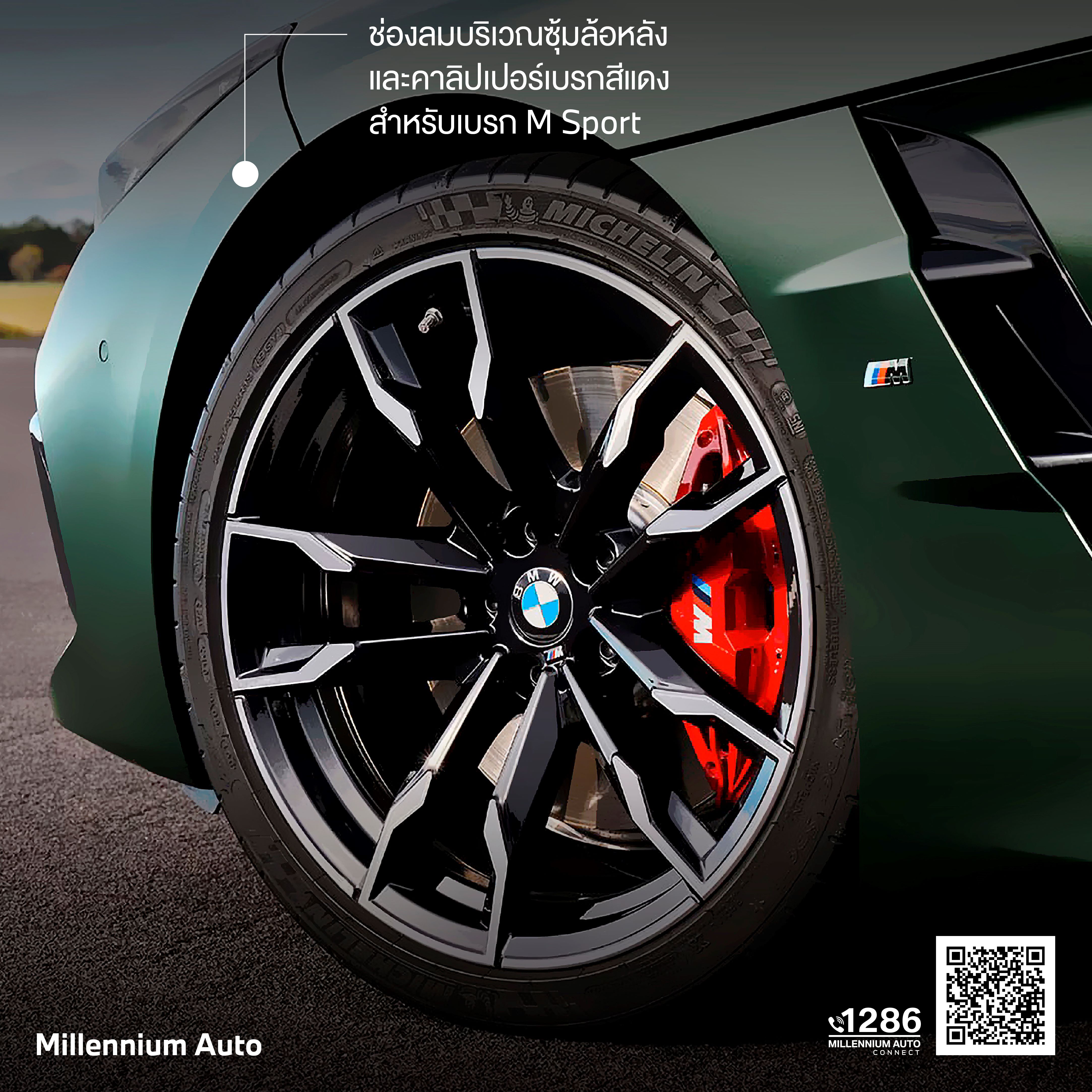 • ช่องลมบริเวณซุ้มล้อหลังและคาลิปเปอร์เบรกสีแดงสำหรับเบรก M Sport